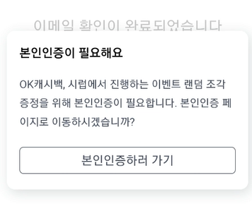 OK캐시백, 시럽 등에서 진행하는 이벤트 랜덤 조각 증정을 위해서는 추가로 본인인증이 필요하다고 합니다. 본인인증하러 가기를 누르고 본인인증을 마무리해주시면 됩니다.