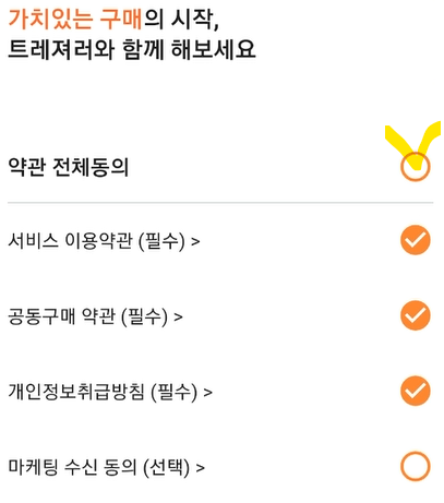 다음이나 구글과 가튼 검색엔진에서 트레져러 홈페이지를 찾아 접속합니다. 우측 상단에 보이는 회원가입을 누르면 다음과 같은 약관 전체동의 화면이 나타납니다.