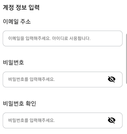 화면을 좀 더 내리면 계정 정보 입력 화면이 나타납니다. 이메일 주소와 비밀번호를 입력합니다.