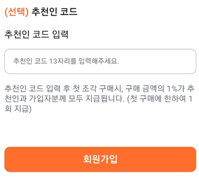 마지막으로 추천인 코드 입력 단계입니다. 추천인 코드를 입력하게 되면 첫 조각 구매시 구매 금액의 1%가 추천인과 가입자 두 분에게 모두 지급된다고 하니 안할 이유가 없겠습니다.