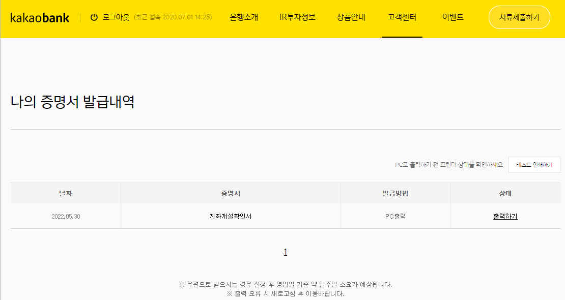 카카오 뱅크 PC 홈페이지에서 이제 나의 증명서 발급내역 중 방금 전에 모바일 앱으로 신청한 계좌 개설 확인서를 확인하고 출력하실 수 있습니다.