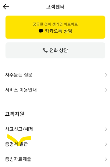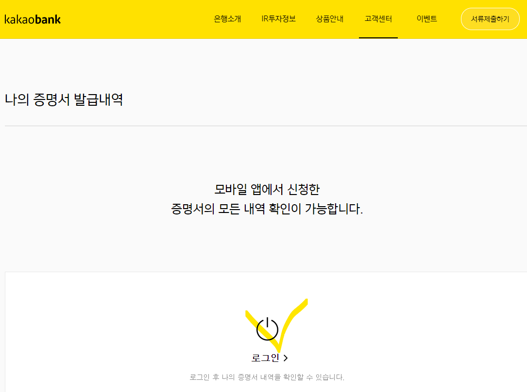 - 카카오 뱅크 앱 > 전체 메뉴 > 고객 센터 > 증명서 발급
