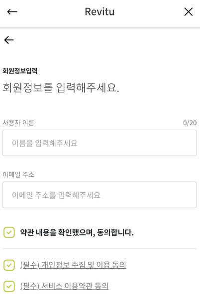 다음은 레비튜 회원정보를 입력해주세요. 사용자 이름 이메일 주소의 입력과 약관 동의가 필요합니다. 입력하고 아래쪽에 보이는 가입하기 버튼을 눌러주세요.