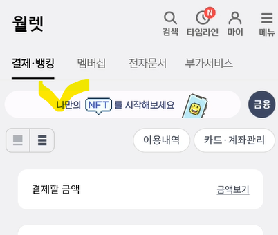 신한플레이 월렛 메뉴 화면으로 다시 돌아오면 '나만의 NFT를 시작해보세요'를 다시 눌러서 해당 내역을 확인해보시기 바랍니다. 저의 경우 신한카드 'MY NFT' 서비스 웰컴 카드 등을 확인할 수 있었습니다.