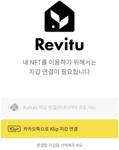 확인을 누르니 레비츄(Revitu) 화면이 나타나는데요. 내 NFT를 이용하기 위해 지갑 연결이 필요하니 아래쪽에 보이는 카카오톡으로 Klip 지갑 연결 부분을 눌러주세요.