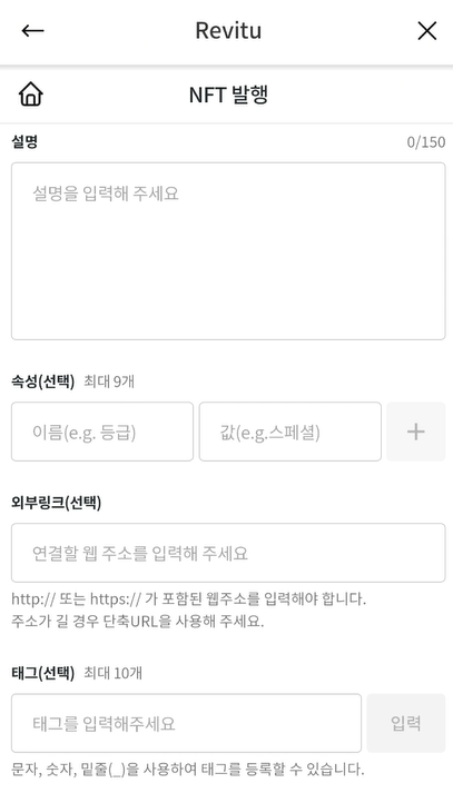 레비츄 회원정보를 입력한 후에 드디어 NFT 발행 화면이 나타납니다. 아래의 내용을 작성해서 나만의 NFT를 발행하시면 됩니다.
