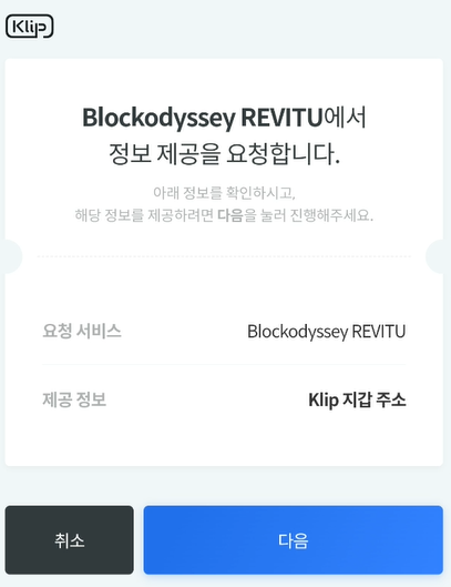 클립 지갑 연결을 누르고 블록오디세이 레비츄(BlockodysseyREVITU)에서 정보 제공을 요청합니다. 그냥 다음 버튼만 눌러주면 정보 제공이 완료됩니다.