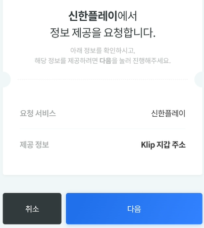 카카오톡으로 Klip 클릭 지갑 연결 버튼을 눌러주세요. 정보 제공 요청이라는 화면에서 신한 플레이가 클릭 지갑 주소 정보를 요청하려면 다음 버튼을 눌러주시면 정보 제공이 완료됩니다.