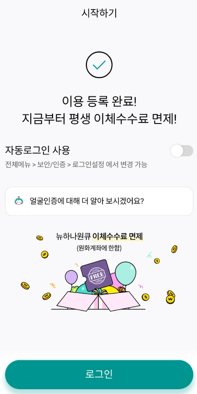 하나원큐 앱 설치가 모두 끝나면 시작하기 버튼을 눌러 계좌 비밀번호와 간편 비밀번호 입력이 포함된 다음의 과정에 따라서 본인과 계좌의 확인, 사용할 간편 비밀번호 입력 등을 통해 앱 이용 등록을 완료할 수 있습니다.