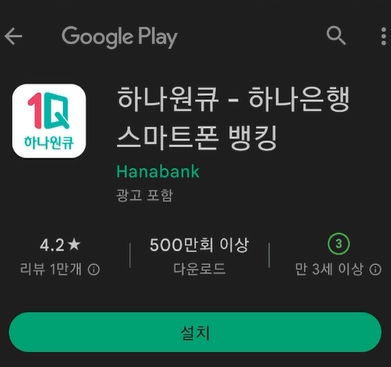 핸드폰 구글플레이에서 하나 원큐, 하나은행 등으로 검색해서 찾은 모바일 앱을 설치합니다. 앱의 명칭은 하나 원큐 - 하나은행 스마트폰 뱅킹입니다.