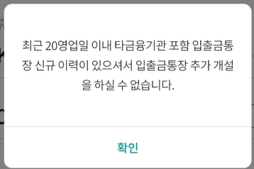 만약 최근 20 영업일 이내 타 금융기관 포함 입출금통장 신규 이력이 있으신 경우는 추가 개설을 하실 수 없다고 확인됩니다. 대응 방법은 20 영업일이 지날 때까지 기다릴 수밖에 없습니다.