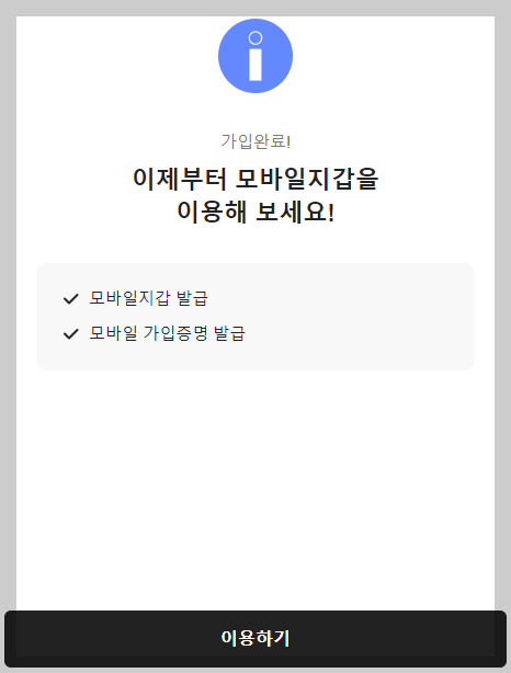계속하기 버튼을 누르면 가입이 완료됩니다. 이제부터는 모바일 지갑을 이용할 수 있다고 나옵니다. 이용하기 버튼을 눌러 계속 진행하여 주세요.