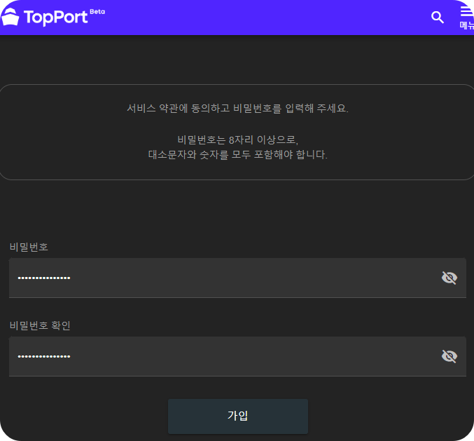 팝업창을 이용해서 모바일 지갑 가입을 완료한 다음, 탑포트 홈페이지 화면으로 다시 돌아와서 사용할 비밀번호를 입력해주세요. 8자리 이상 대소문자와 숫자 모두 포함해야 합니다.