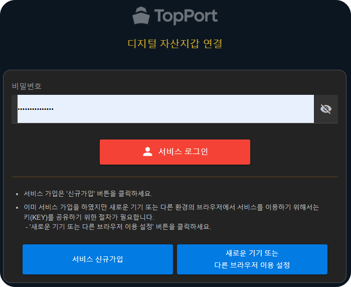 디지털 자산지갑 연결화면에서는 비밀번호를 그대로 입력한 상태에서 서비스 로그인 버튼을 눌러주시면 됩니다. 이제 로그인이 정상적으로 완료되는지 확인하시기 바랍니다.