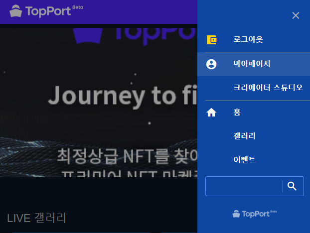 skt의 NFT 마켓 탑포트 TopPort 서비스에 가입이 완료되면 로그인한 후 메뉴에서 마이페이지로 이동해봅니다.