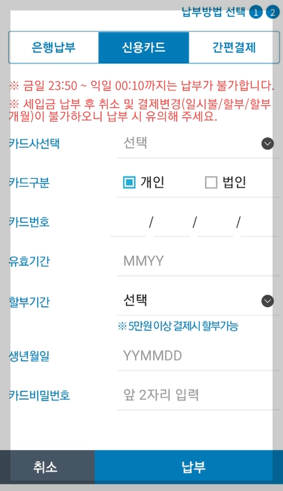 선택된 납부금액을 확인해서 다음 버튼을 누른 후 납부방법 중 하나를 선택해서 납부하시면 됩니다. 저는 신용카드로 납부해보겠습니다. 세입금은 납부 취소가 절대 불가능하니 유의하시기 바랍니다.