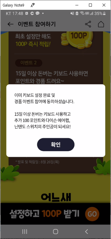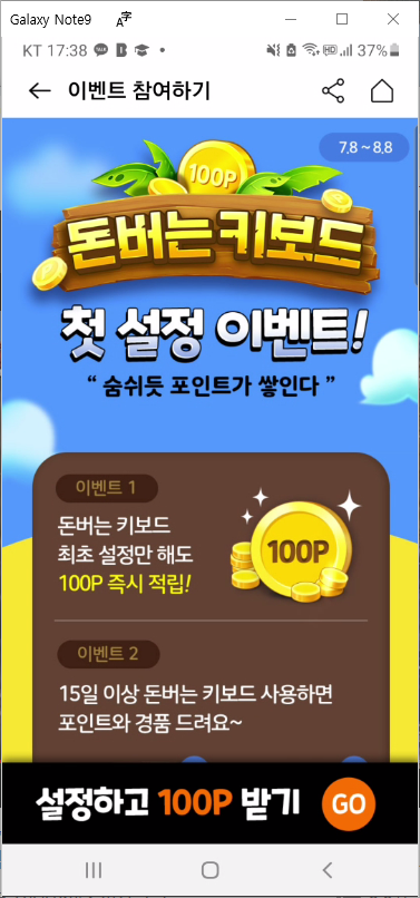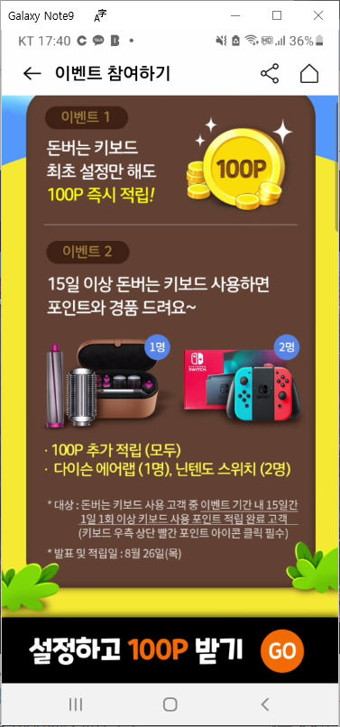 - 돈버는 키보드 이벤트 하면 하단의 "설정하고 100P 받기 GO" 부분을 클릭합니다.
