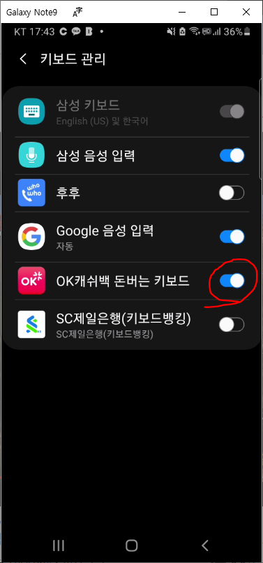 - OK 캐쉬백 돈 버는 키보드 슬라이드를 오른쪽으로 밀어서 켜주셔야 합니다.