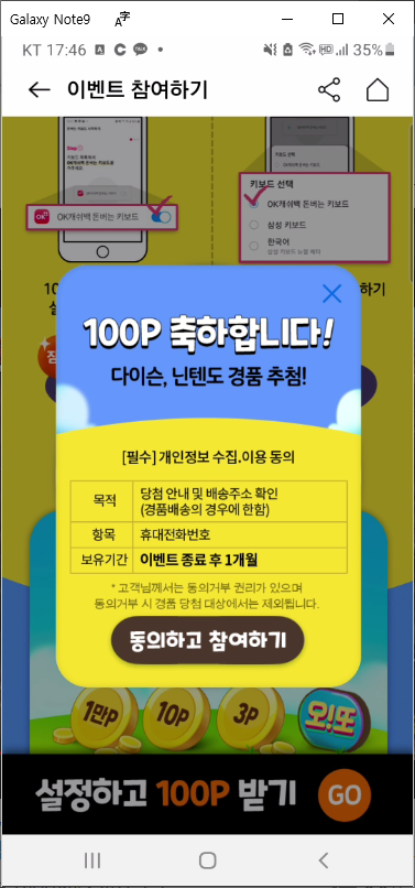 오캐이캐쉬백 돈 버는 키보드 설정 후 경품 참여하기
