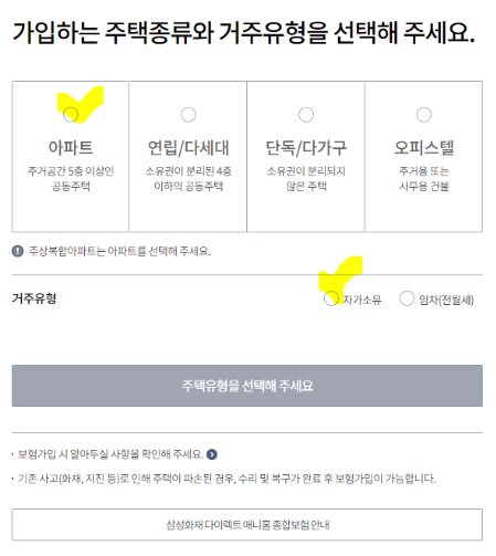 주택화재보험 보험료 산정을 위해 우선 가입하시려는 주택의 종류 그리고 거주 유형을 선택하시고 다음을 눌러주시면 됩니다.
