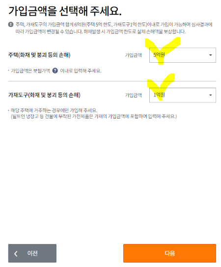 ※ 보험료 시뮬레이션을 위해 각각 최고 금액으로 설정해보겠습니다. 5억 원, 1억 원.