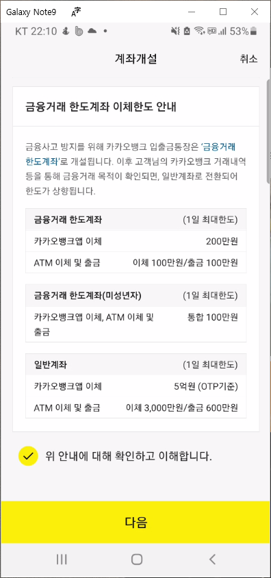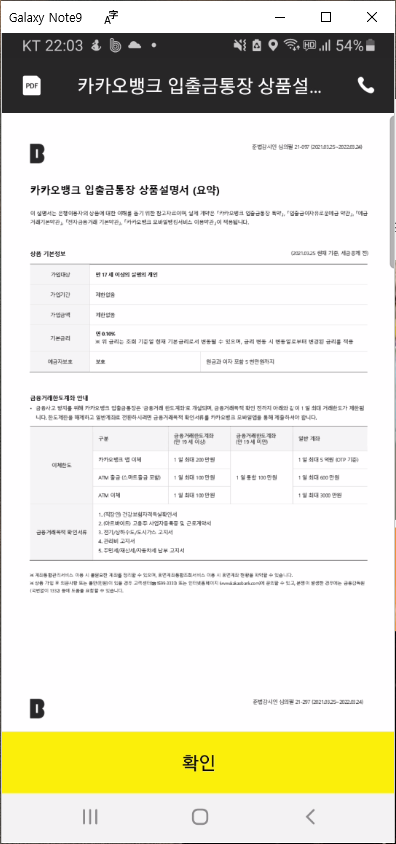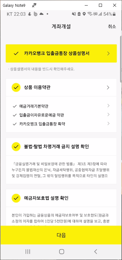 계좌 개설 화면에서 카카오 뱅크 입출금통장 상품설명서를 포함해서 모든 약관 확인은 하나씩 클릭해서 확인 버튼을 눌러주셔야 됩니다.