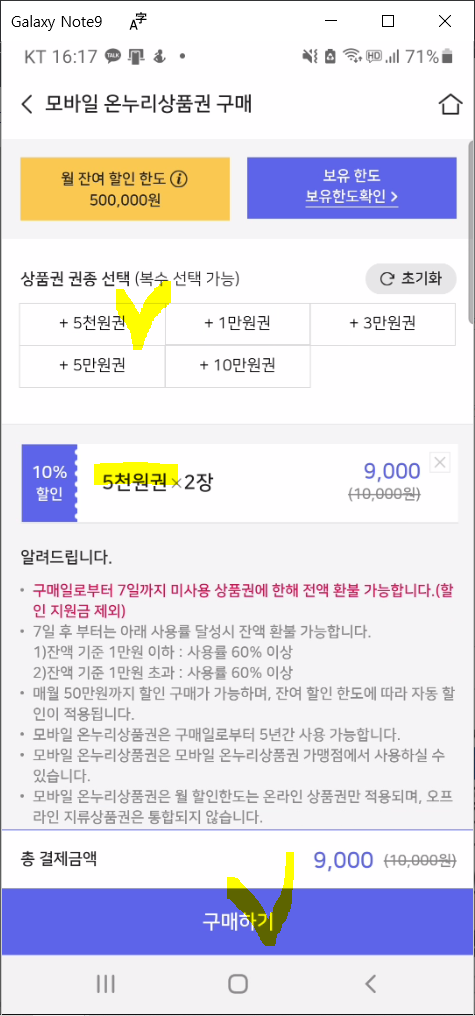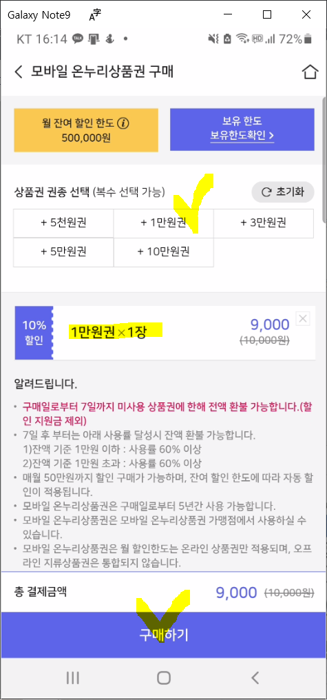 정해진 할인 한도 금액까지는 상품권을 할인받아 구매할 수 있습니다. 이후 구매분은 정가 구매.