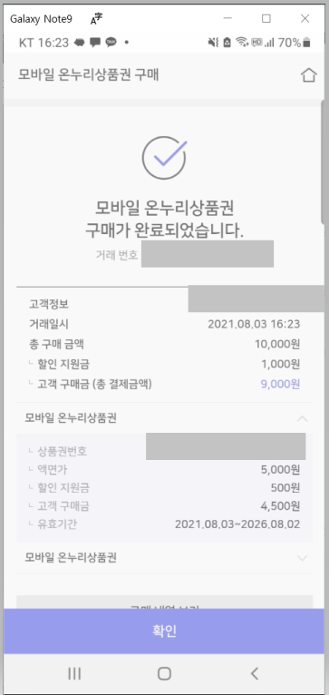 상기와 같이 드디어 모바일 온누리 상품권의 구매가 완료되었다는 화면이 조회됩니다.