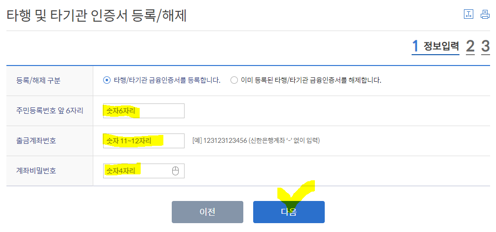 신한은행 타행 및 타기관 인증서 등록/해제 (타행 금융인증서인 경우)