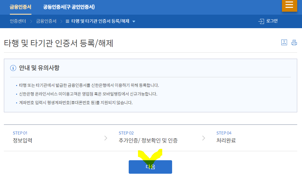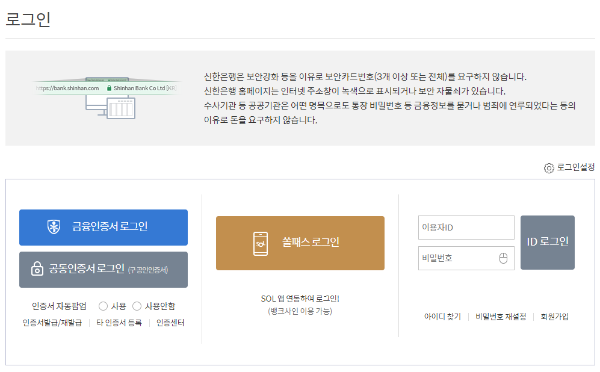 실제 제가 사용한 금융인증서가 신한은행이 아닌 국민은행에서 발급된 것이라 바로 로그인을 되지 않았습니다.