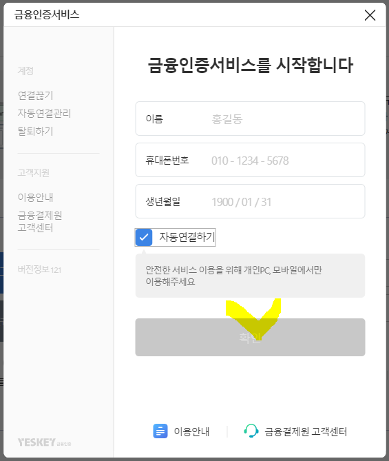 금융인증서비스 팝업(Pop-up) 화면이 조회되면 먼저 다음과 같은 화면에서 이름, 휴대폰 번호, 생년월일을 입력하고 확인해주셔야 합니다.