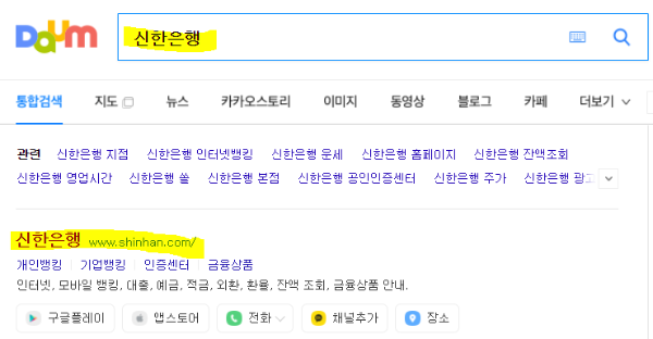다음이나 구글에서 신한은행을 검색 후 찾은 홈페이지 주소 url을 클릭해서 접속합니다.