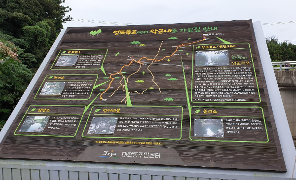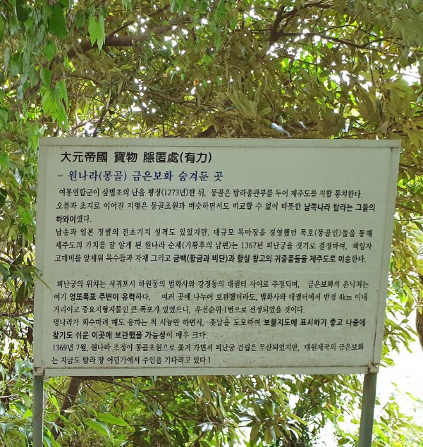 엉또폭포 전망대에서 내려오는 길에 원나라 몽골 금은보화 숨겨둔 곳이라는 푯말내용이 눈에 들어오는데요. 진실인지는 알 수 없으나 원나라 순제가 피난궁을 짓기위해 이송하던 황금, 비단과 귀중품을 제주도로 이송하다 엉또폭포 어딘가에 묻혀있으리라는 이야기가 입가에 살짝 미소를 머금게 합니다.