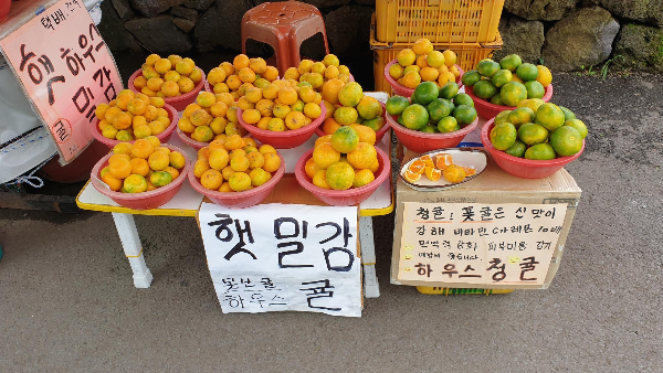 교회에서 엉또다리를 지나오면 엉또폭포로 올라가는 길 입구에 밀감과 청귤을 팔고있어요. 청귤은 청귤청을 만들어볼까하는 생각에 사고싶었지만 내려오는 길에 구매를 고민하기로 했습니다.