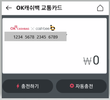 발급된 오케시캐쉬백 교통카드는 4X4 16자리 숫자로 된 번호를 가지고 있습니다. 그럼 직접 발급받아 확인해보시기 바랍니다.
