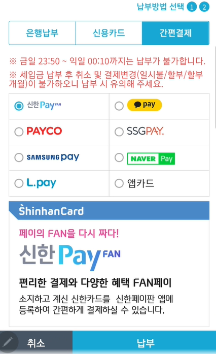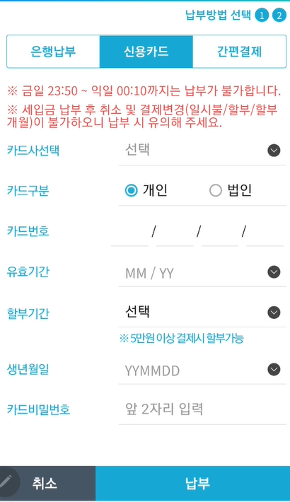 - 납부방법 선택 : 은행납부 / 신용카드 / 간편 결제 --> 3가지 방법 중 택 1 (신용카드 추천! 할부기간 적용)