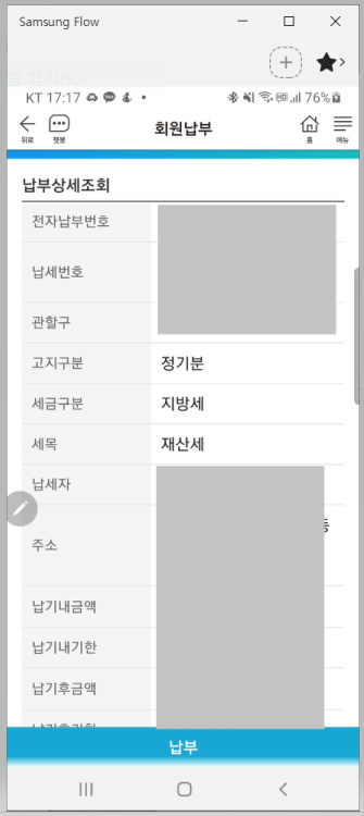 화면 하단에 보이는 "납부" 버튼을 클릭하고 다음의 절차에 따라 납부합니다.