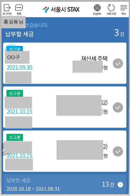 본인이 기등록한 인증방식으로 로그인을 마치면 STAX 화면에 바로 납부할 세금 리스트가 조회됩니다. 그 중에 정기분 해당 지자체의 재산세 항목을 클릭해서 확인하시면 됩니다.