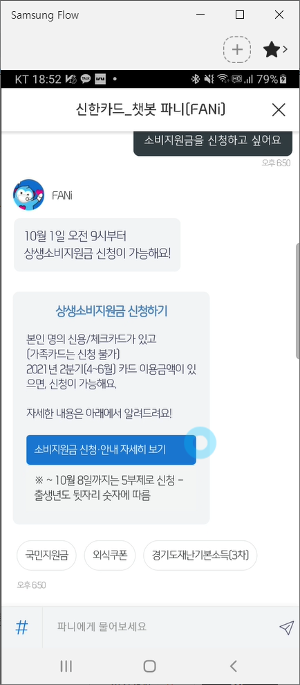 갑자기 신한카드 챗봇(파니 FANi)과 채팅을 시작했는데요. 톡 내용에 보이는 "소비 지원금 신청 안내 자세히 보기" 버튼을 클릭해 보겠습니다.