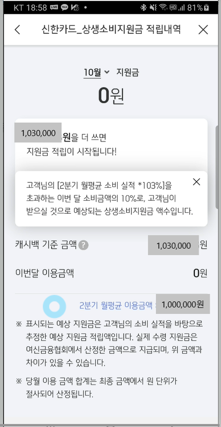신한카드 상생소비지원금 이용안내 : 적립내역