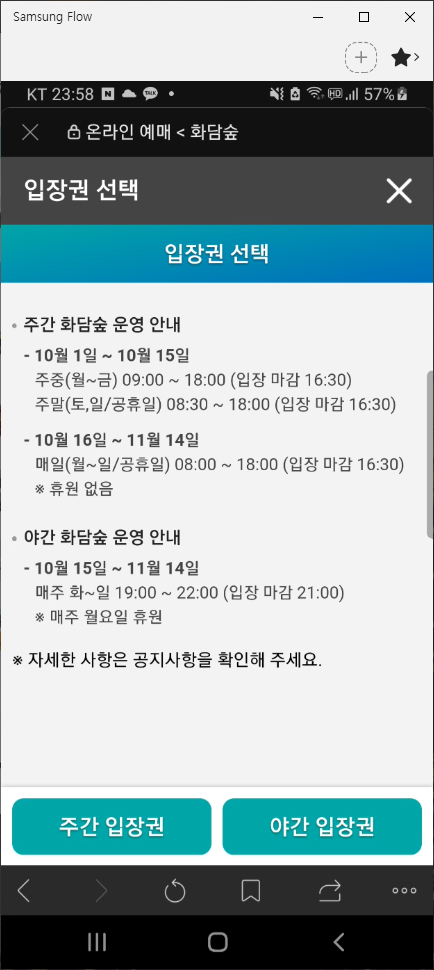 - 주간 입장권 또는 야간 입장권 선택