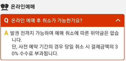 단, 사전 예약 기간의 경우 당일 취소시 결제금액의 30% 수수료 부과됩니다.