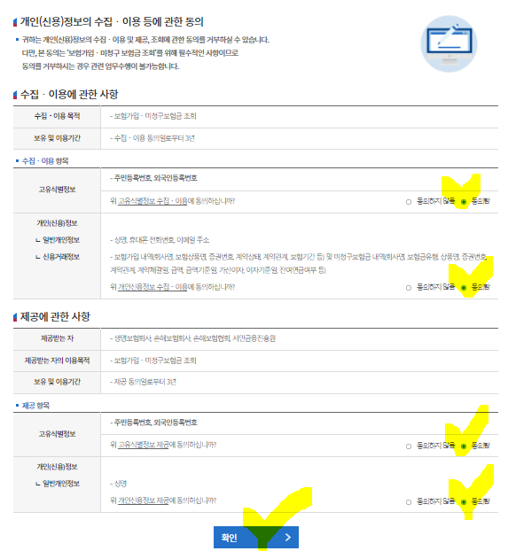 정보동의 단계에서는 개인(신용) 정보의 수집 이용에 관한 동의를 해주셔야 합니다. 화면에 보이는 항목들에 동의함으로 모두 체크한 후 확인 버튼을 눌러주세요.