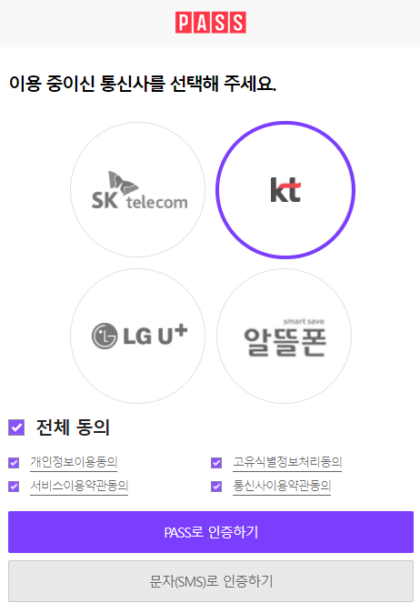저의 경우 휴대폰 인증을 시도했는데요. PASS로 인증하기를 이용하기 때문에 간편하게 본인인증을 완료하실 수 있습니다. (PASS를 잘 모르시는 분은 문자 SMS로 인증하기를 이용하세요.