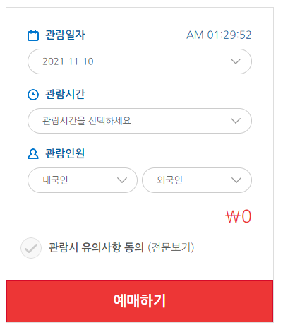 - 후원 외국인 관람시간에는 내국인 예약 불가(단, 외국인 동반자가 있는 경우 내국인은 2명까지 입장 가능)