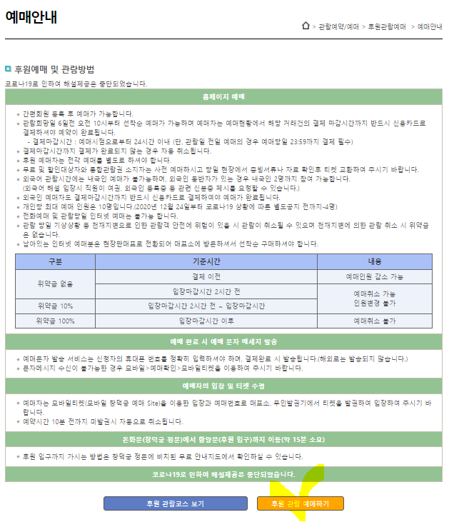 후원 관람 예매의 예매안내 화면에서 맨 하단에 보이는 "후원 관람 예매하기" 버튼을 클릭합니다. 예매 전에 후원 관람 코스를 보실 분들은 "후원 관람코스 보기" 버튼을 먼저 클릭해보세요.