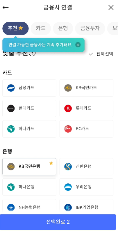 카드, 은행, 금융투자, 보험, 통신, 전자금융, 할부금융 등의 금융사들 중에서 본인이 이용하고 있는 금융기관을 선택한 다음 아래쪽에 보이는 '선택 완료' 버튼을 눌러주시면 됩니다.