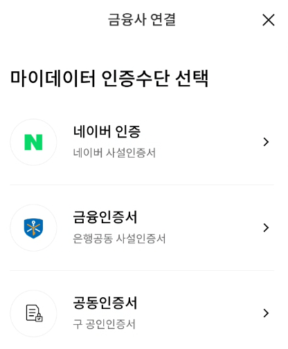 금융사 연결 시 마이 데이터 인증수단을 선택해주세요. 네이버 인증, 금융인증서 그리고 공동 인증서 중에서 하나를 선택하시면 됩니다.