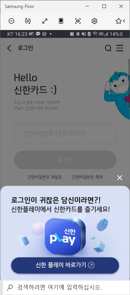 신한카드 앱을 핸드폰에서 실행하고 로그인을 해주시기 바랍니다. 저의 경우 간편 비밀번호를 이용하 로그인을 잘 이용하고 있습니다.
