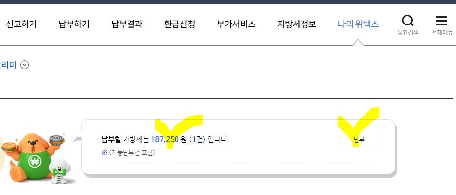 위택스 로그인 후 나의 위책스 메뉴 화면에서 납부할 지방세가 있으면 건수와 금액을 바로 알려주기 때문에 납부하러 바로 이동하실 수 있어요.